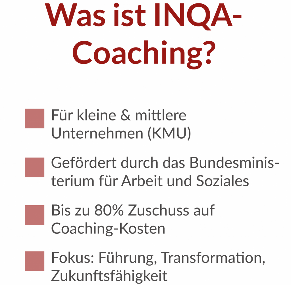 Wenn Sie sich für ein INQA-Coaching interessieren, können Sie eine INQA-Erstberatung in einer regionalen INQA-Beratungsstelle (IBS) in Anspruch nehmen. In der Beratung klären Sie gemeinsam die Fördervoraussetzungen sowie den konkreten betrieblichen Unterstützungsbedarf. Sind die erforderlichen Bedingungen erfüllt, stellt Ihnen die IBS einen INQA-Coaching-Scheck aus. Den Coaching Check können Sie bei einem qualifizierten und autorisierten INQA-Coach wie mir einlösen!
